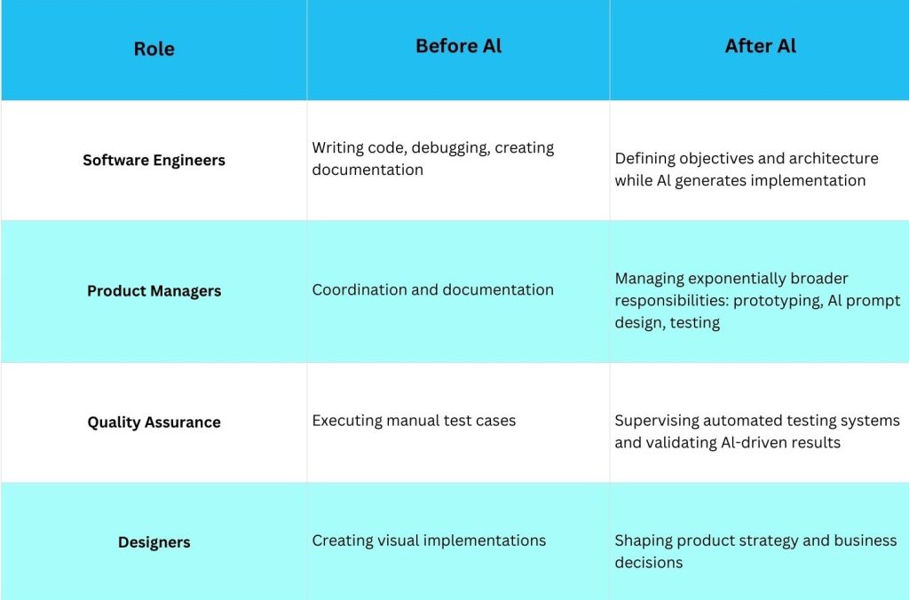 Technology companies are already demonstrating how roles are evolving under AI. Consider how specific roles are evolving in tech: