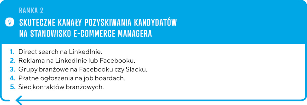Poszukiwania kandydatów na stanowisko e-commerce managera wymagają zwykle innych metod niż w przypadku stanowisk niższego szczebla. Aby dotrzeć do odpowiednich kandydatów, warto wykorzystać różnorodne kanały i aktywnie prowadzić działania rekrutacyjne (ramka 2).