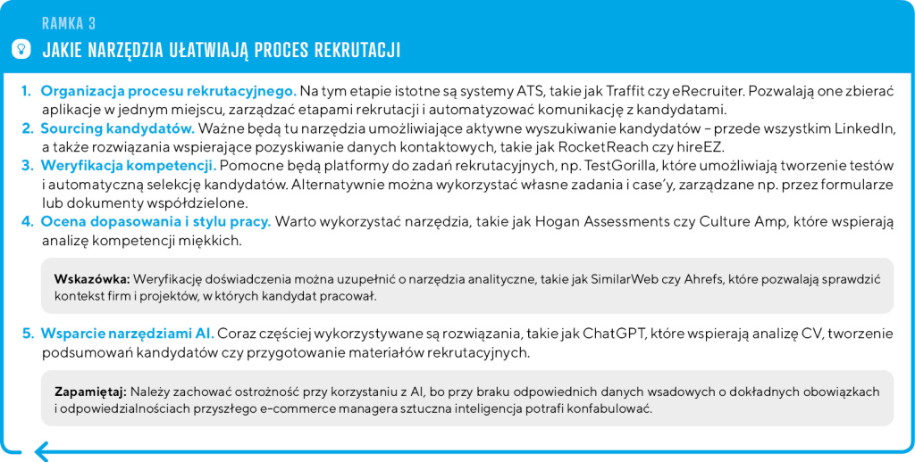 W rekrutacji e-commerce managera warto wykorzystać narzędzia, które wspierają cały proces rekrutacji – od pozyskania kandydatów po ich ocenę (ramka 3).