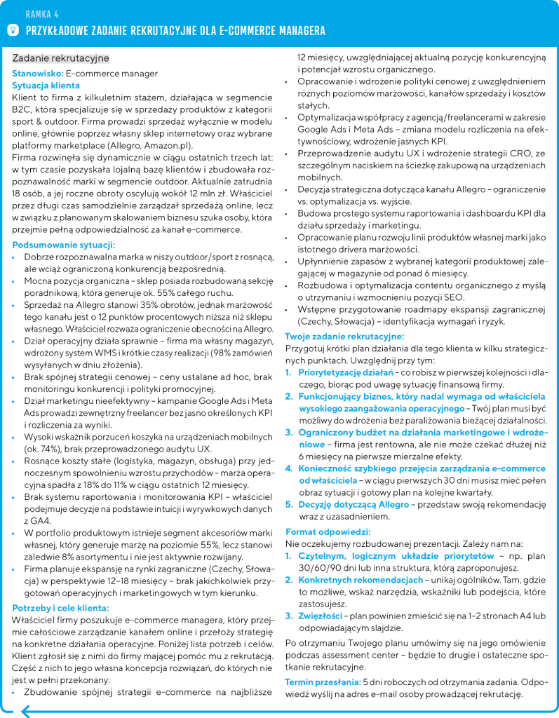 Kolejnym etapem, który warto uwzględnić, jest zadanie rekrutacyjne dla e-commerce managera (ramka 4 na następnej stronie). Pozwoli ono lepiej poznać, jak kandydat postrzega problemy i jakie stosuje metody ich rozwiązywania.