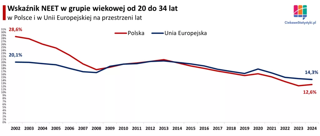 W 2024 roku wskaźnik NEET w Polsce wyniósł 12,6%, co oznacza, iż ok. 787 tysięcy młodych Polaków nie uczyło się i nie pracowało. To wynik lepszy niż średnia unijna (14,3%), ale przez cały czas niepokojąco wysoki.