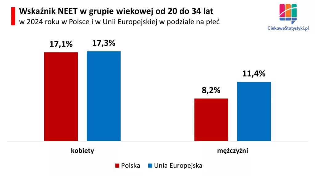 - Młode kobiety są częściej NEET niż młodzi mężczyźni — w 2024 roku w Polsce odsetek NEET-ów wyniósł 17,1% dla kobiet i 8,2% dla mężczyzn.