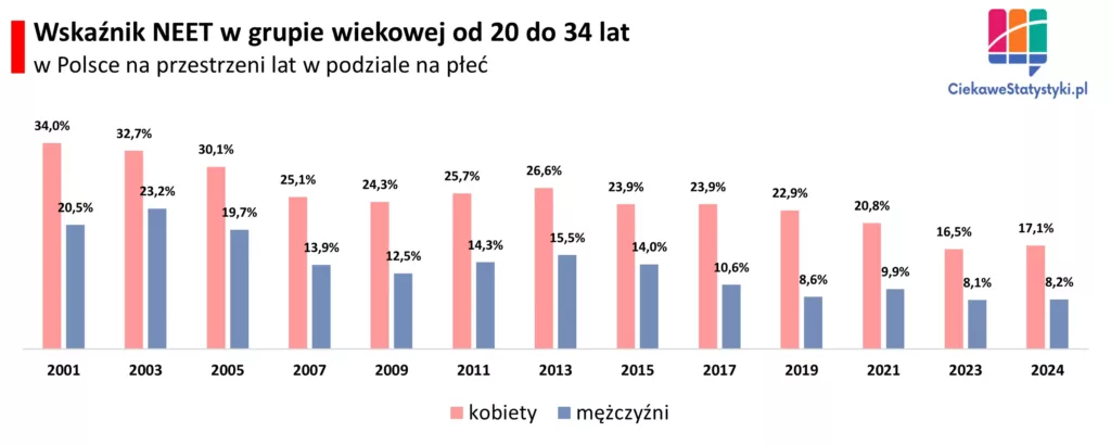 W Polsce w 2024 roku odsetek młodych mężczyzn, którzy zakończyli naukę i nie podjęli zatrudnienia był ponad dwukrotnie niższy niż kobiet. Nie kształciła się i nie pracowała prawie co szósta młoda kobieta w wieku od 20 do 34 lat.