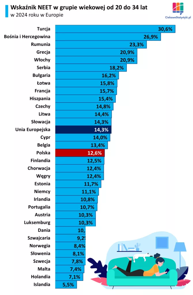 - Wskaźnik NEET w Polsce w grupie 20–34 lat wynosi 12,6%.