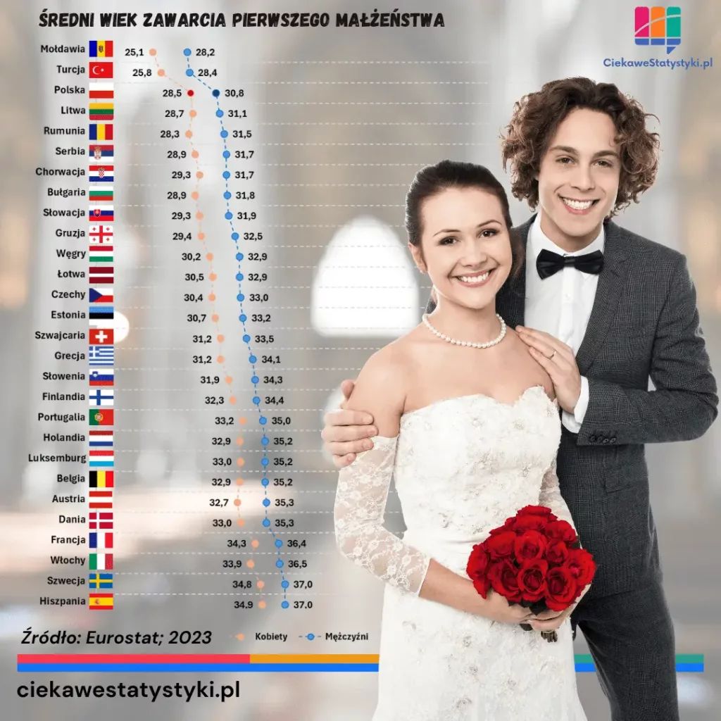 Według danych Głównego Urzędu Statystycznego (GUS), w 2023 roku średni wiek, w którym kobiety w Polsce wychodziły za mąż, wynosił 29,2 lat, podczas gdy mężczyźni wstępowali w związek małżeński mając średnio 31,4 lat. W porównaniu do lat 80., jest to wzrost o około 6-7 lat w przypadku obu płci.