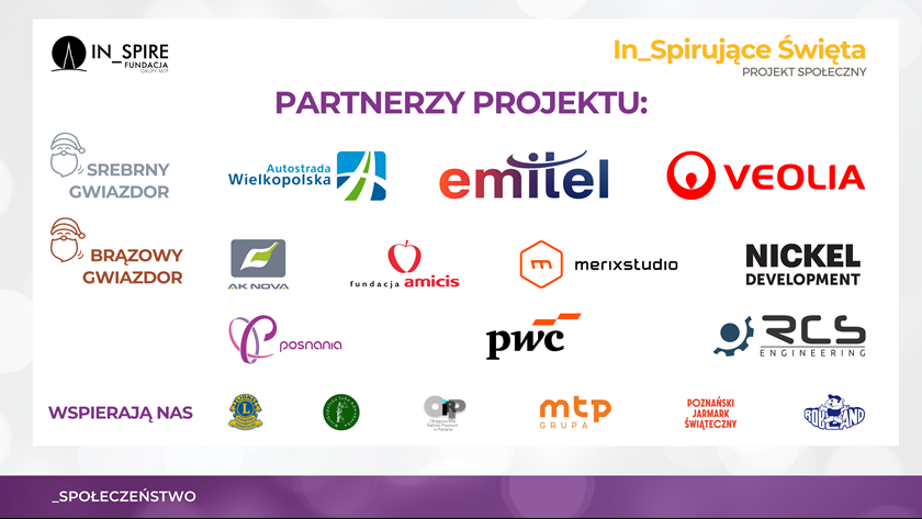 W akcję „In_Spirujące Święta” włączyły się wielkopolskie firmy i instytucje, które jako Partnerzy, Sponsorzy i Mecenasi projektu przyjęły rolę świątecznych gwiazdorów. To właśnie dzięki ich wsparciu możliwa była realizacja czwartej edycji tego wyjątkowego przedsięwzięcia.