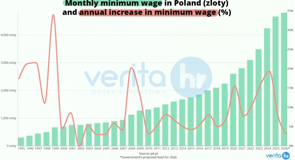 Source: Notes From PolandMeanwhile, Poland will continue its practice of regular adjustments: by law, the minimum wage is reviewed annually (and even updated twice a year if inflation exceeds 5%) to safeguard employees’ purchasing power. This means mid-year raises remain possible in high-inflation scenarios, as seen in 2023–2024.
