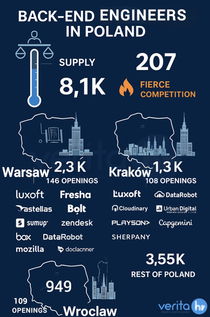 According to Verita HR Group data, there is roughly 8,100 back-end professionals in Poland, including 2,300 in Warsaw, 1,300 in Kraków, and 949 in Wrocław. However, only 363 active job offers were listed nationwide in the last few months, clear proof that supply is tight and the competition for proven engineers is fierce.
