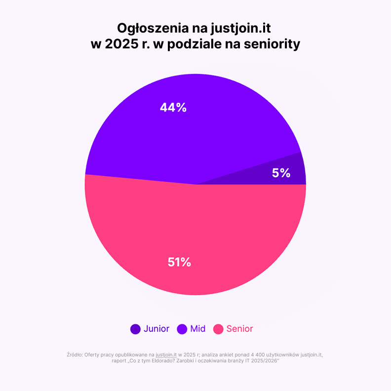 Ożywienie rynku jest jednak wybiórcze i brutalne dla początkujących. Bariera wejścia do branży IT osiągnęła historyczne maksimum. Aż 96 proc. wszystkich ogłoszeń w ubiegłym roku skierowano do seniorów i midów. Juniorzy, zaledwie z 4,79 proc. udziałem w rynku ofert, stali się marginesem statystycznym.