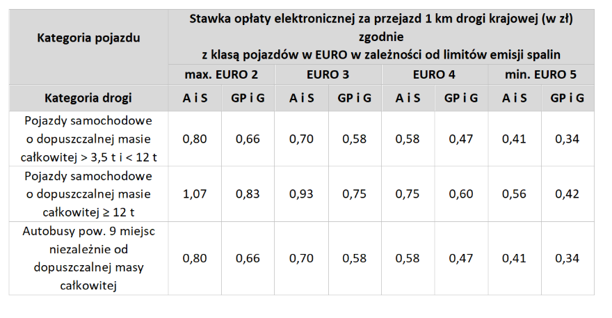Wysokość stawek opłaty elektronicznej za przejazd 1 km dla dróg krajowych przedstawia poniższa tabela: