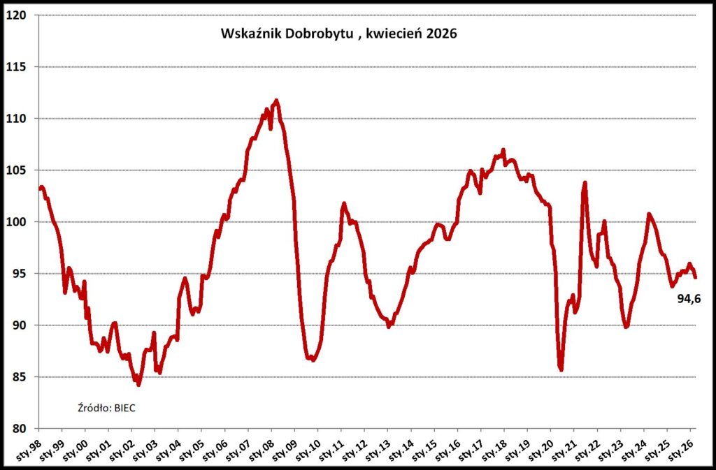 Wskaźnik Dobrobytu odzwierciedlający ekonomiczną kondycję polskiego społeczeństwa w kwietniu 2026 spadł o 0,2 punktu w stosunku do wartości z marca br. i był to drugi z rzędu spadek. Podstawowe składowe wskaźnika decydujące o naszym poczuciu dobrobytu, takie jak zmiany na rynku pracy, zmiany w dochodach oraz zmiany cen, w ostatnich miesiącach pogorszyły się.