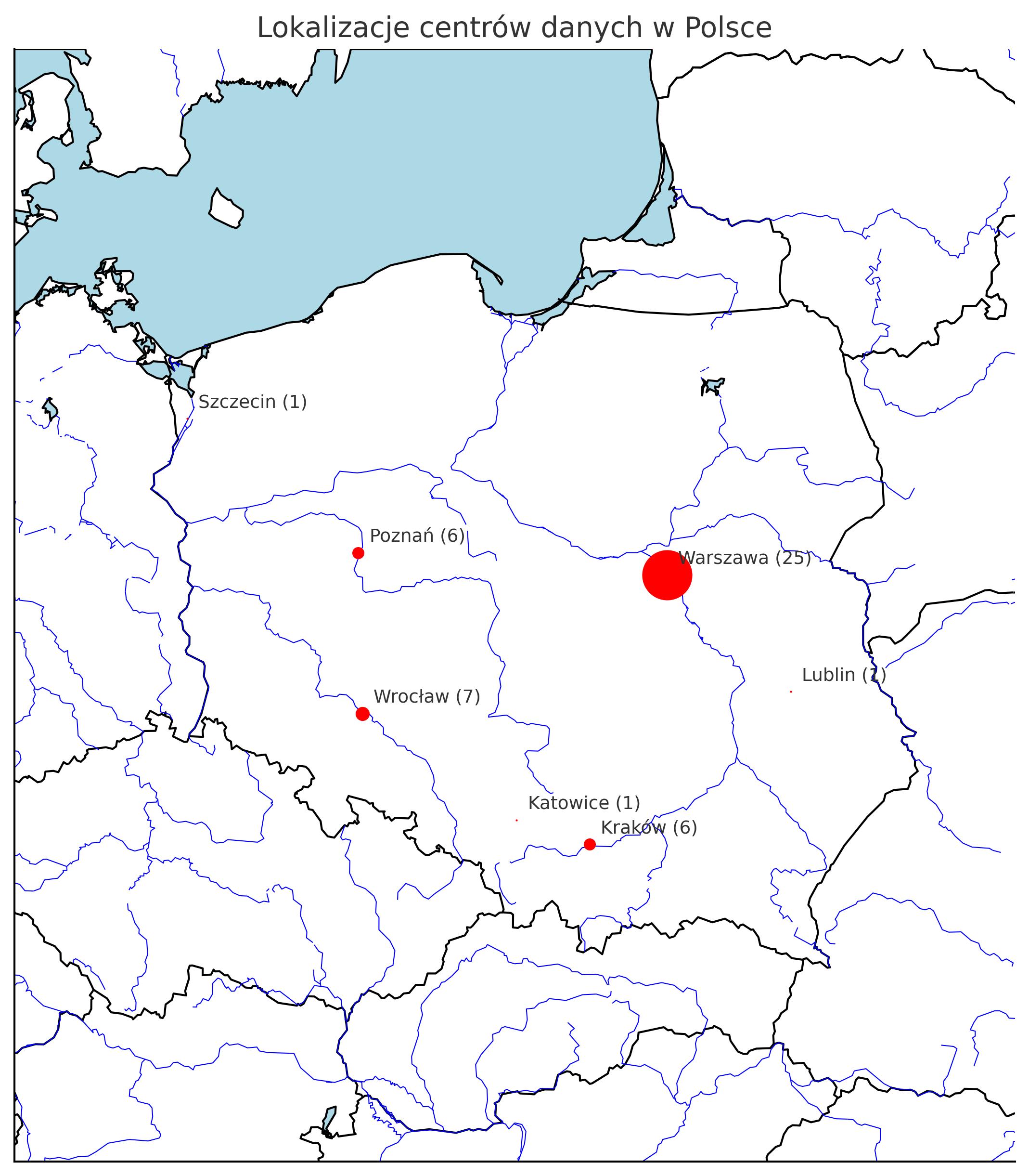 Koncentracja centrów danych w określonych regionach, takich jak Warszawa, prawdopodobnie odzwierciedla obecność kluczowych ośrodków biznesowych, głównych węzłów wymiany ruchu internetowego oraz rozwiniętej infrastruktury telekomunikacyjnej. Przedsiębiorstwa zwykle lokują swoją infrastrukturę IT w pobliżu swojej działalności oraz tam, gdzie dostępna jest szybka łączność internetowa. Duże miasta, takie jak Warszawa, charakteryzują się większą koncentracją firm i lepszą infrastrukturą, co przyciąga inwestycje w centra danych. Szacuje się, iż Warszawa gości około 28 do 48 centrów danych, co stanowi znaczną część krajowej infrastruktury.